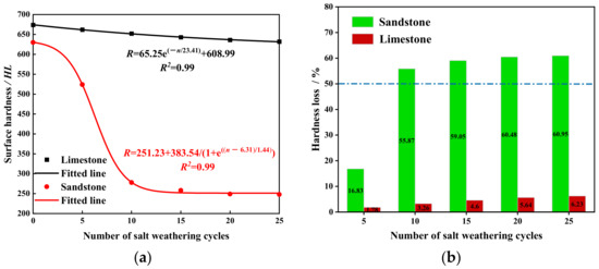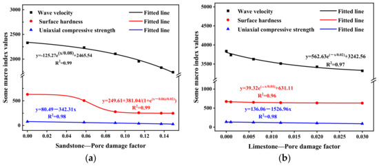 - Sulfate weathering induced physical and chemical reactions that accumulated microstructural damage in the surface layer of the rock samples, resulting in visible instantaneous macroscopic damage and a series of changes in macroscopic indicators, such as reduced mass, decreased wave velocity, and weakened strength. The pore damage factor of sandstone was approximately 2–4 times higher than that of limestone. The pore damage factors of both rock types could be fitted with exponential (y = ae(x/b) + c), exponential (y = a + b/(1 + e(x−c)/d), and linear (y = ax + b) functions for wave velocity, surface hardness, and compressive strength, respectively (where a, b, c and d are constants). However, there were notable differences in the magnitude and rate of change.