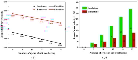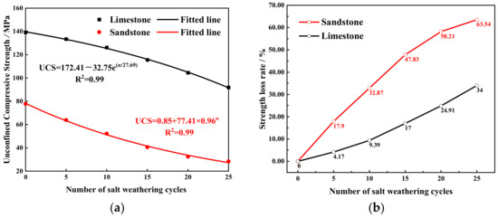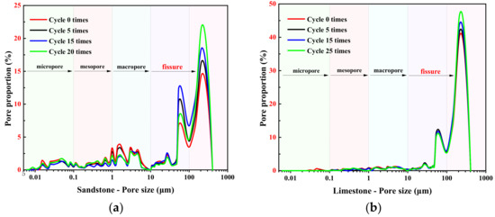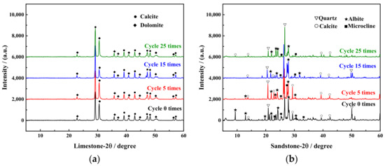 - The macroscopic indicators of both rock types, such as mass, wave velocity, and compressive strength, decreased to varying degrees, with sandstone deteriorating at a much faster rate than limestone. The number of cycles affecting both rock samples could be fitted with linear or exponential functions for wave velocity and compressive strength, but notable differences existed in their trends of change. The combined effects of the rock lithology and sulfate damage mechanism led to a gradual decrease in the calcite content and an increase in the dolomite content in the limestone sample. Additionally, the number of pores larger than 100 μm distinctly increased. In the sandstone sample, there was an obvious decrease in the content of calcite and feldspar minerals, a decrease in the number of pores smaller than 10 μm, and a significant increase in the number of pores larger than 14 μm.