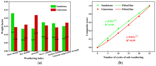 - The entropy weight–TOPSIS method was used to comprehensively evaluate the rock damage state by normalizing multiple indicators, assigning weights to different weathering indicators, and calculating the relative proximity to the distance between the best and worst solutions for each indicator. The weight factor for mass loss was the highest in the sandstone sample, while the porosity of the limestone sample reflected a sensitivity to sulfate erosion. Overall, the sandstone exhibited a fast–slow change trend in its overall damage level, while limestone exhibited a slow–fast decay trend.