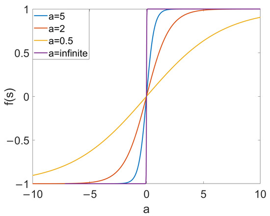 As is well known, the sign function is a discontinuous switching function that undergoes instantaneous switching near the zero point, resulting in high-frequency oscillations of the system state as it approaches the stable point along the sliding-mode surface. To suppress the controller’s flutter, replacing the sign function with the function is proposed. The value of in the function determines the change speed of the value of the smooth function near the origin, as shown in Figure 2. When tends to infinity, the smooth function approximates the sign-switching function. When the value of is very small, the thickness of the boundary layer is too large, resulting in a slow convergence rate. Therefore, is chosen on the balance of these two aspects. The introduction of this function effectively reduces the flutter of the system.