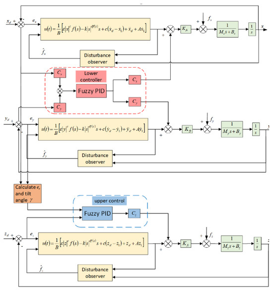 From Equation (31), it can be seen that when the lower contour error and the upper contour error approach zero, the spatial contour error will also approach zero. Therefore, the proposed double-layer contour error model is effective. In this study, controllers were devised separately for the upper and lower layers and were subsequently integrated to achieve the suppression of three-dimensional spatial contour errors. The comprehensive construction of the dual-layer contour error model was elaborated upon by Dainlin Zhang et al. in reference [37]; thus, this aspect will not be reiterated in this paper. Building upon the foundation of the above-referenced work, further controller design was conducted to suit the manufacturing environment applicable to this study.