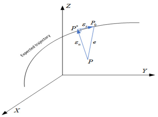The geometric relationship between the actual and reference positions point calculates the contour error. In multi-axis motion control systems, some scholars internationally use three-dimensional nonlinear estimation methods [35] and vector methods [36] to estimate the contour error of multi-axis motion control systems. The nonlinear trajectory of multi-axis motion is shown in Figure 7, where is the reference position, is the actual position, and is the tracking error.