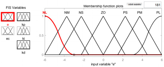 Step 1: Take the error and the error change rate as the input of the fuzzy controller, take the PID controller parameters , , and as the output, and set the fuzzy subset of the input and output of the fuzzy controller as , where the elements represent negative large, negative middle, negative small, zero, positive small, positive middle, and positive large, respectively. In the membership function editor of the fuzzy logic toolbox, membership functions are established for each fuzzy language variable, as shown in Figure 11.