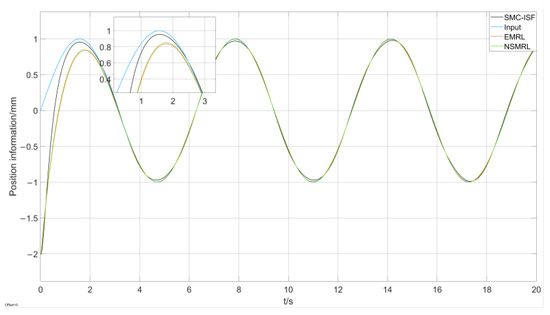 According to Table 7, it can be observed that the proposed method in this paper significantly reduced the contour errors of spatial curves with multiple curvatures compared to references [34] and [35]. In comparison to reference [34], the maximum contour error, average contour error, and integrated absolute error (IAE) of the proposed method decreased by 32.2%, 80.2%, and 39.3%, respectively. Compared to reference [35], the proposed method reduced the average contour error, contour error, and IAE by 56.4%, 63.9%, and 68.7%, respectively. The method proposed in reference [34] faced challenges in tracking the target curve due to frequent curvature changes, leading to the algorithm’s difficulty in timely tracking the desired trajectory, resulting in an overall system performance that fell behind the target curve. While the method introduced in reference [35] exhibited a smaller mean value than that of reference [34], the fluctuating tracking performance in the presence of external disturbances was evident from the max and IAE values. This algorithm occasionally failed to keep up with the target curve during the frequent curvature changes, and it occasionally exceeded the target curve. In contrast, the proposed method in this paper demonstrated excellent system performance when tracking spatial curves with multiple curvatures.