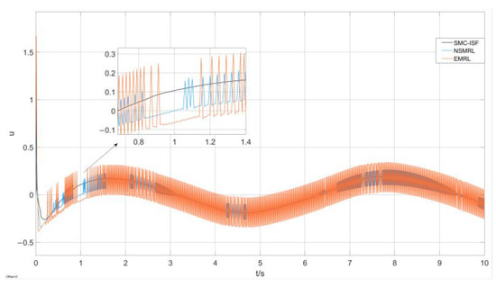 Equation (6) shows that the control input contains discontinuous terms, , which is the key to causing the flutter, and the flutter level directly reaches the value of .