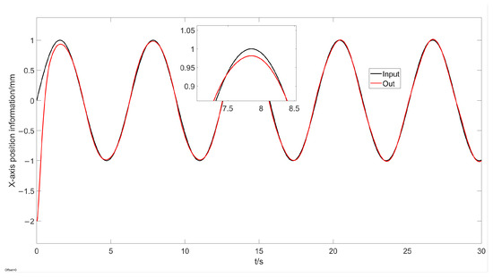 According to the system structure diagram shown in Figure 6, based on building a single-axis sliding-mode disturbance observer, the designed fuzzy PID cross-coupling controller was added to the composite layered contour control system, and the effectiveness of the fuzzy-PID-based cross-coupling control was compared and analyzed against traditional PID cross-coupling control. In addition, the trial and error method was used to obtain the fixed values of the traditional PID controller parameters , , and , while the self-tuning curve of the fuzzy PID control parameters is shown in Figure 26.