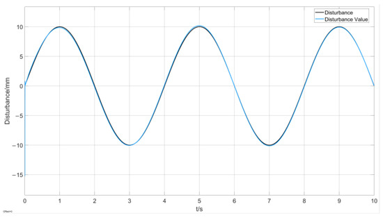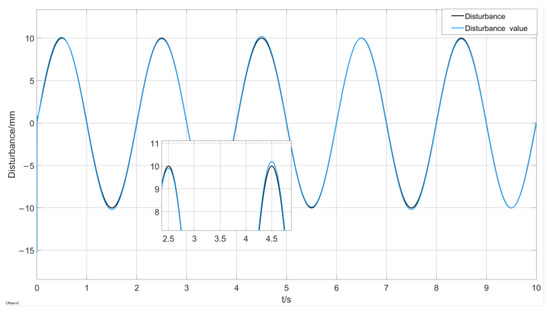The sampling frequency of the controller is usually much greater than the change time of the external disturbance, so the external disturbance can be considered as a constant value during the sampling period, which is . Furthermore, by incorporating the disturbance observer Equation (23) into Equation (24), it can be concluded that: