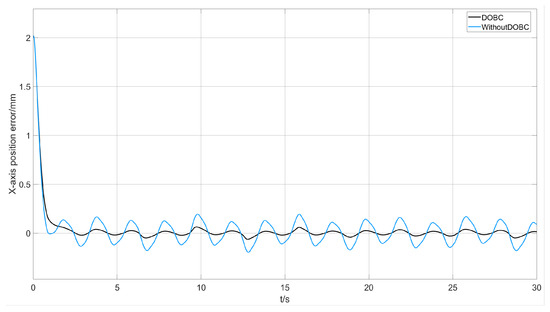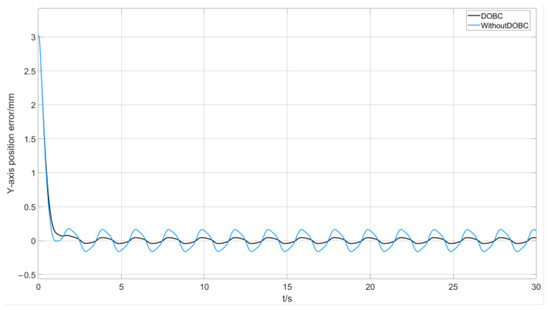 Among them, sliding-mode control [19,20] has become a research hotspot amongst the current control methods because of its insensitivity to system model parameter perturbation and its strong robustness, and it is suitable for use in complex and strongly nonlinear multi-axis control systems. Examples of sliding-mode control applications in motors can be found in references [21,22,23] and others. However, sliding-mode control is not flawless. Due to the presence of the sign switch function, traditional sliding-mode control generates high-frequency chatter when the controlled state approaches the stable point of the system in practical use. Therefore, scholars of sliding-mode control have proposed many improved methods to suppress chatter, such as the reaching law [24], the high-order sliding-mode method [25], and the non-singular terminal sliding mode [26]. To eliminate the influence of external disturbance and ensure the stability and robustness of the system, this sliding-mode control paper must set the switch gain to be relatively large, and the increase in the switch gain will lead to severe flutter, so the design of the switch gain must change with the change in the external disturbance to obtain a minimum gain that can suppress disturbance. However, in practical applications, it is challenging to determine the upper and lower bounds of external uncertainty disturbances, and even if the type of disturbance can be fully understood, the switch gain cannot be adjusted in real time. Therefore, while improving the sliding-mode approach law, a disturbance observer is introduced to estimate and compensate for uncertain external disturbances, thereby improving the accuracy of single-axis positioning while suppressing flutter phenomena. Based on enhancing the sliding-mode disturbance observation controller, the position error information of each axis is introduced into the cross-coupling controller, and mutual correction is carried out through contour error compensation to reduce the contour error caused by the independent information of each axis.