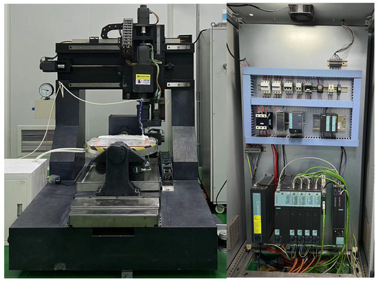 This experimental platform adopts a modular design method to achieve communication and control between the various functional units of the CNC system and has good scalability. The experimental platform system includes three parts, as shown in Figure 25: an 840D motion controller, an electrical drive control system, and a three-axis linkage CNC machine tool body.