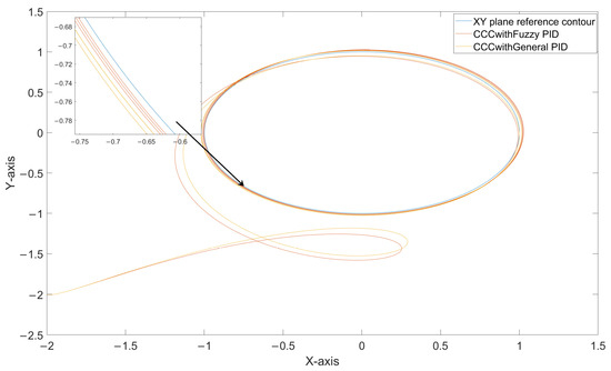 Preserving the prerequisite of single-axis positioning accuracy, the introduction of the composite hierarchical control significantly enhances the adaptability in the spatial contour controller design. Different levels of accuracy requirements are accommodated through the design of distinct controllers for each level. For the XY plane’s lower-level contour, a fuzzy PID controller is employed to address the complex and strongly nonlinear environment of the multi-axis servo control system. Comparative simulation experiments with the traditional centered combination control (CCC) method illustrated that the fuzzy-PID-based lower-level control approach not only enhances the accuracy of the XY plane’s lower-level contour by 84.39% but also further improves the overall contour accuracy by 84.45%.