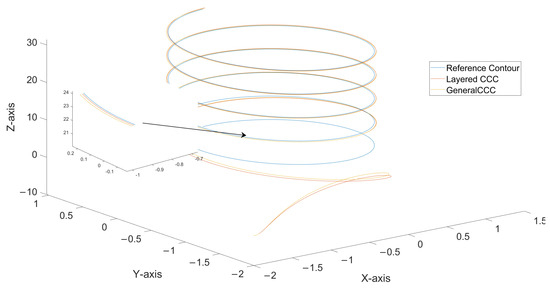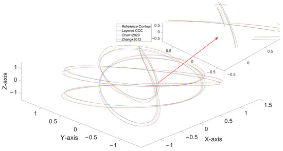 Figure 29 portrays the comparative outcomes between the composite layered contour control algorithm (CLCC) and the results of incorporating solely the lower-level cross-coupling controller. Contrasting with the observations from Figure 29, the CLCC algorithm demonstrated a substantial enhancement in terms of the spatial contour curvature upon the integration of the upper-level cross-coupling controller. The space between the desired contour and the actual contour evolved from having a discernible gap to near elimination. Computational assessment revealed that the ultimate contour error achieved by the CLCC algorithm measured 0.0115 mm. This constitutes a 61.9% improvement over the preceding XY lower-level control algorithm’s 0.0302 mm and a 94% augmentation compared to the traditional cross-coupling control algorithm’s −0.1935 mm. Following the comprehensive series of algorithm performance test analyses, it is evident that the designed CLCC algorithm is efficacious. It not only addresses the precision of individual planes’ contours but also significantly elevates the overall contour precision.