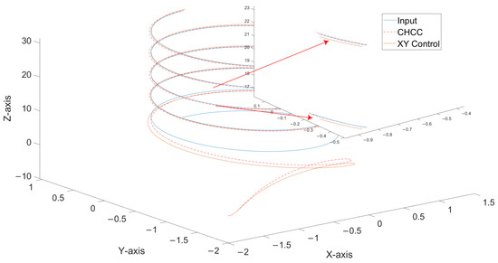 The simulation time was 5 s, ensuring that the simulation curve could display multiple spatial ellipses. The parameters of the single-axis controller were the same as those in Section 4.1. The fuzzy PID parameters in the composite layered controller were adjusted by fuzzy rules, and the proportional controller parameter value was 2.3, which needed to be adjusted according to different spatial curves. From Figure 24, it can be seen that due to the system state being set to [−2, −2, −2], the three methods in the simulation needed to start converging from a distance from the reference curve. The method proposed in reference [35] performed worse than the other two methods at the beginning of the convergence. During the process of moving from a distance from the reference curve to approaching the reference curve, the method proposed in this paper had a similar effect to the method proposed in reference [34], but after multiple stages of elliptical line tracking, the method proposed in this article basically followed the target curve.