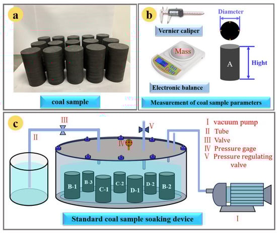 Coal sample soaking process with (a–c) the standard coal samples, measuring devices and water-immersion facilities, respectively.