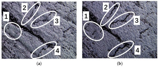 The softening effect of water on coal is mainly due to the dissolution of water on the microstructure of coal []. Many scholars have pointed out that coal undergoes corrosion effects and crack propagation during immersion [,,]. This paper conducted structural observation in the coal immersed for 14 days with a microscope magnification of 100×. As shown in Figure 2, despite the limited resolution, changes in the crack state are obvious after water immersion, exhibiting a crack width which is expanded and slightly propagated.