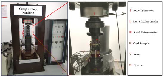 In order to avoid the influence of the external environment, the whole set of experimental equipment is placed at a constant temperature at 20 C. The axial and radial deformation of the sample was measured using an extensometer and the axial force was measured according to a force sensor. Force controlling is adopted as the loading method and real-time data is collected throughout the loading process. The creep experiments applied a graded loading method, where the initial stage is 3 MPa and the loading increment for each stage is 2 MPa. The loading rate is set as 0.001 MPa/S, the duration of each stage is 24 h, and the final stage loading time was determined by the failure time of the tested sample.