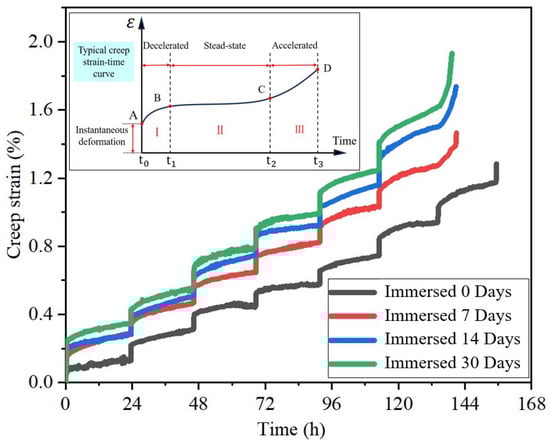 When the amount of creep load is greater than its own strength limit, the specimen enters the accelerated creep deformation stage; at this time, the damage begins to accelerate from the damage region to the surrounding integrity of the region diffusion, ultimately leading to plastic damage of the specimen, of which the accelerated creep rates of the specimen with different immersion times are shown in Figure 10. It can be seen that the longer the specimen immersion time, the faster its rate in the accelerated creep deformation stage, and the accelerated creep rates of the specimen versus the immersion time show an upward trend. The reason for this phenomenon is the softening effect that occurs after the specimen is immersed in water, where the longer the immersion time, the more pronounced the softening effect.