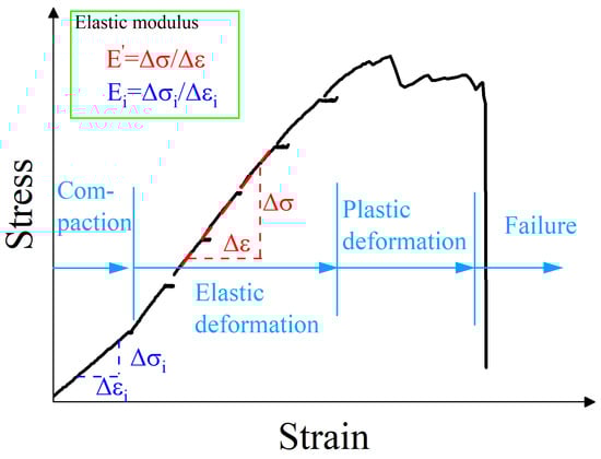 The elastic modulus versus loading stress is displayed in Figure 7, where the compaction of the coal specimen was also observed, exhibiting the initial growth in the elastic modulus. From the second level of loading stress, despite a slight fluctuation of the calculated elastic modulus, it kept stable as the corresponding elastic region, as illustrated in Figure 5. Plastic damage appeared with the promoted loading stress, resulting in the continuous deduction of the elastic modulus in Figure 7.