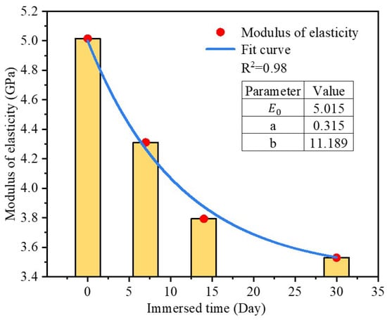 The nature of the deformation of the immersed specimen at the initial loading stage is in accordance with Hooke’s law as a linear elastic stress–strain relationship. The calculated elastic modulus of specimens A, B, C, and D are 5.01 GPa, 4.31 GPa, 3.79 GPa, and 3.52 GPa, respectively. As plotted in Figure 6, the data of the elastic modulus yields the fitted function with a variable of the immersion time, in which , , and , and the residual sum of squares .