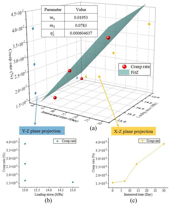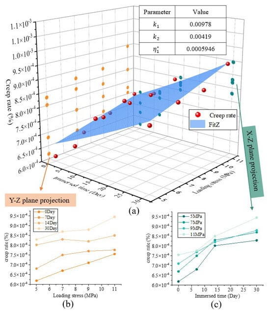 In order to analyze the influence of the water-immersion time and stress level on the creep properties of the coal samples, the creep rates were calculated in this subsection. In order to obtain the steady-state creep rate of the coal samples during the constant velocity creep stage, stress levels of 5 MPa, 7 MPa, 9 MPa, and 11 MPa were selected during the graded loading processes. The steady-state creep rates of the coal samples were calculated for different immersion times and a three-dimensional scatter plot was drawn. The X-axis represents the immersion time, the Y-axis means the stress, and the Z-axis is the creep rate. The results are shown in Figure 9a. From Figure 9a, it can be observed that the loading stress and immersion time have certain effects on the creep rate. To investigate this effect, three-dimensional scatter plots are projected onto the Y-Z plane and X-Z plane, respectively.