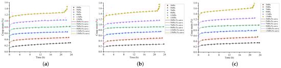 Strain–time fitting curve for (a) specimen immersed for 7 days; (b) specimen immersed for 14 days; and (c) and specimen immersed for 30 days.