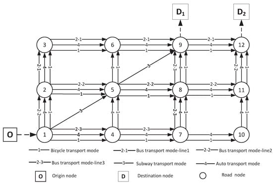 Consider a multi-modal transportation network, , where , respectively, are the sets of physical nodes and physical links. As shown in Figure 1, the network includes two pairs and four transport modes. The origin is set as Node 1, and the destinations as Node 9 and Node 12, respectively. The transport modes in the multi-modal network are, respectively, bicycle (transport mode 1), bus (mode 2), subway (mode 3), and auto (mode 4). Specifically, there are three lines of transport mode buses with corresponding operating frequencies and bus vehicles with a specific number of seats and capacity. The physical node in the network is also a transfer node; that is, travellers can complete a probable transfer on any physical node. In this multi-modal transportation network, travellers can choose one or more modes of transportation.There will be these travel modes: bicycle, bus, subway, car, bicycle+bus, bicycle+subway, bus+subway. In practice, if the traveller chooses car (mode 4), it is impossible for transfer behavior to occur most of the time. Therefore, the combination of cars and other modes of transportation is not considered.