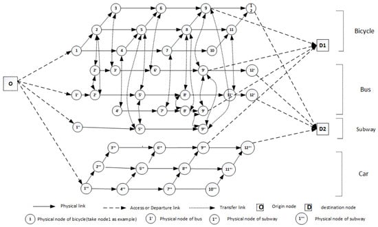 To flexibly present combined- and pure-mode trips, the supernetwork concept is adopted, in which the probable transfer rules are automatically captured completely. This is accomplished by constructing the sub-network layer for each transport mode and connecting the origin to the sub-network of each transport mode by the access link, which represent online travel behavior and off-road behavior. And nodes of the sub-network of each transport mode are connected to the corresponding (same-named) nodes of other single-transport-mode networks by transfer links, connecting the destinations to the sub-network of each transport mode, which represent the transfer behavior in the physical node. According to the actual travel behavior of most travellers and the convenience of research, we assume that a traveller cannot transfer more than two times, and the car mode does not involve any transfers.