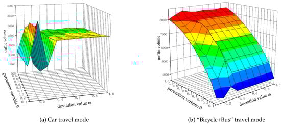 Travellers’ choices were investigated under different levels of perception variables and deviation values in terms of travel mode and travel route choices. To simplify the analysis, the distribution results of two typical travel modes (car and “bicycle + bus”) and two links (5–8, 7–10) were selected for the analyses of Figure 5 and Figure 6.