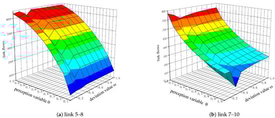 It can be seen from Figure 5 and Figure 6 that as the deviation value increases from 0.1 to 1, the distribution results show only slight fluctuations on the whole except when and . For the results of the modal split, the traffic volume of cars increases rapidly at , then decreases rapidly at . On the contrary, the traffic volume of the “bicycle + bus” travel mode decreases rapidly at , then increases rapidly at . Regarding link flow distribution, the passenger flows of both links 5–8 and links 7–10 decrease rapidly at . In addition, the value of the perception variable also has significant effects on travellers’ route and mode choice behaviors. It can be seen from Figure 5 and Figure 6 that as the deviation value increases from 0.1 to 1, the overall trend of the distribution result increases. This is because the perception variable in the logit model represents the travellers’ perceptions of the information of the road network, and higher values reflect a more accurate grasp of the available information, which results in the logit choice model being closer to deterministic choice behaviors. In practice, compared to other travel modes, the ETC of car and “bicycle + bus” travel modes is lower. Therefore, the traffic volume of these two modes is increasing, and the link flows are increasing accordingly.