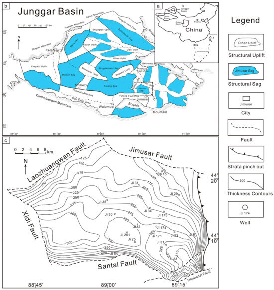 (a) Geographical Location of the Junggar Basin, China. (b) Geographical Location of the Jimsar Sag in the Junggar Basin. (c) The distribution position of some drilled wells in the Jimsar Sag (modified after Qiu et al. (2016) [4]).