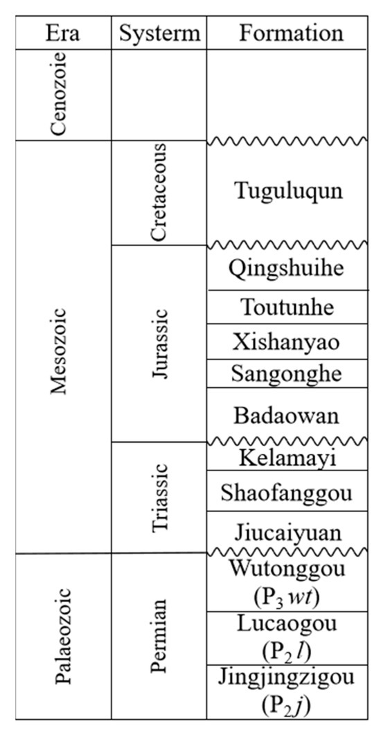The Jimusar Sag can be found in the east of the Junggar Basin in northwest China [4] (Figure 1a,b). The stratigraphic formations from top to bottom of the study area at the Junggar Basin include the Cretaceous, Jurassic, Triassic, and Permian (Jingzigou Formation, Lucaogou Formation, Wutonggou Formation) Strata [25] (Figure 2). There were over 40 wells in the study area with the purpose of investigating the Lucaogou Formation in the Jimusar Sag, and oil and gas were found from some wells [26] (Figure 1c).