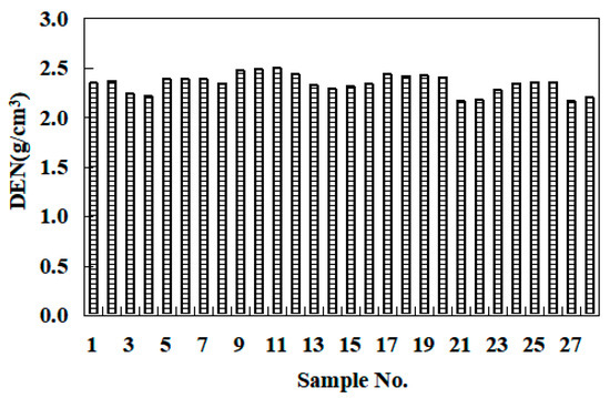According to the relevant requirements of the Chinese Standard GB/T 50266-2013 [27], the mass, average diameter, and length of the sample were measured, and the volume of the sample was calculated. On this basis, the bulk density of the samples can be obtained by dividing the measured mass by the volume.