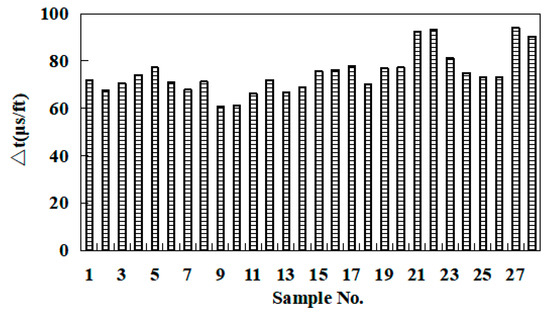 The bulk density of the rock samples is listed in Figure 4, where it can be noted that the bulk density of the samples ranged from 2.17 to 2.50 g·cm−3 with an average of 2.35 g·cm−3. Additionally, there was a certain range of variation in the bulk density of different samples, and the change was less than 0.36 g·cm−3. The difference in bulk density may be caused by the difference in the mineral composition, mineral content, and porosity of samples from the Permian Lucaogou Formation in the Junggar Basin. The P-wave interval transit time of the rock samples is shown in Figure 5 and was between 60.96 and 94.22 μs/ft for the samples, with a mean value of 74.84 μs/ft. There is a certain range of variation in the P-wave interval transit times of different samples, and the change is less than 33.62 μs/ft. The difference in the P-wave interval transit time may be due to the difference in the pore structure of samples from the Lucaogou Formation of Permian in the Junggar Basin. The correlation between the density and the P-wave interval transit time is depicted in Figure S5 (within the Supplementary Data). The P-wave interval transit time decreases with increasing density, with a correlation coefficient of 0.5895. The results of the study are in consistent with the conclusions of previous research [16].
