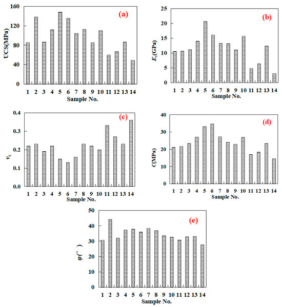 The rock mechanical properties of the samples ((a) uniaxial compressive strength; (b) Young’s modulus; (c) Poisson’s ratio; (d) cohesive strength; (e) internal friction angle).