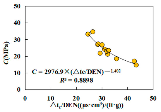 The correlation between the cohesive strength and the P-wave interval transit time is shown in Figure S6 (within the Supplementary Data). From Figure S6 (within the Supplementary Data), the C of the rocks is negatively correlated with the P-wave interval transit time. The fitting effect between the C and the P-wave interval transit time was not good. Therefore, a combination of parameters considering the two parameters of the P-wave interval transit time and density were adopted to develop the equation for estimating the C of the rocks. The relationship between C and Δtc/DEN is described in Figure 8, indicating that the curve based on the power function had the best fit, with an R2 of 0.8898. The empirical equation for estimating the C of the rocks is as follows: