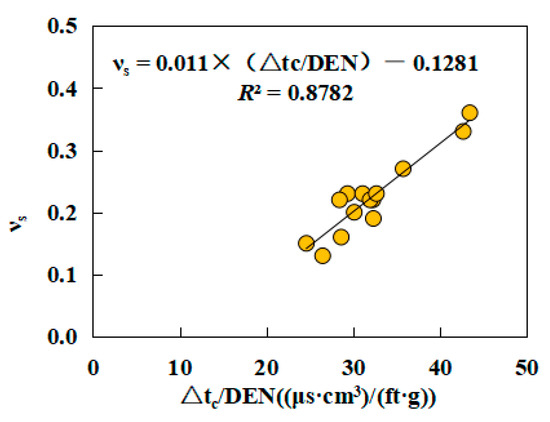The correlation between the static Poisson’s ratio and the P-wave interval transit time is shown in Figure S9. From Figure S9, the νs of the rocks was positively correlated with the P-wave interval transit time, which is consistent with previous studies [16,17], indicating that the νs of the rocks increased with increasing P-wave velocity. The combination of parameters considering the P-wave interval transit time and density was adopted to develop the equation for estimating the νs of rocks because of the higher R2. The relationship between νs and Δtc/DEN is described in Figure 10, where we can observe that the curve based on the linear function had the best-fitting effect, with an R2 of 0.8782. The empirical equation for estimating the νs of rocks is as follows: