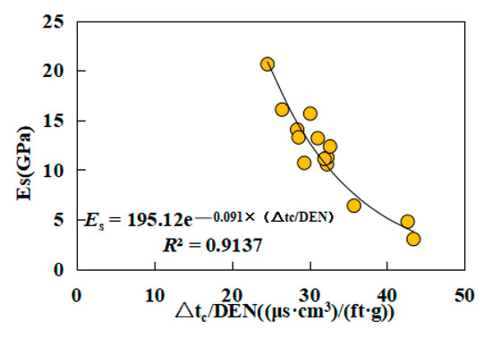 The correlation between the static Young’s modulus and the P-wave interval transit time is shown in Figure S8 (within the Supplementary Data), where the Es of the rocks was negatively correlated with the P-wave interval transit time, consistent with previous studies [19,20,29,33,34], suggesting that the Es of the rocks increased with the increasing P-wave velocity. The combination of parameters considering the P-wave interval transit time and density was adopted to develop the equation for estimating the Es of the rocks because of the higher R2. The relationship between Es and Δtc/DEN is described in Figure 9. Here, it can be seen that the curve based on the exponential function had the best fit, with an R2 of 0.9137. The empirical equation for estimating the Es of the rocks is as follows: