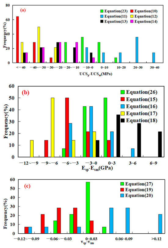 Furthermore, the histograms of the differences between the predicted rock mechanical properties and the corresponding measured values are presented in Figure 11. From Figure 11a, the equation in this study (Equation (23)) predicted the UCS very well, fitting 85.71% of the given data within ±15 MPa, whereas Equations (11), (13) and (14) only fitted 42.86%, 28.57%, and 21.43% of the given data within ±15 MPa, respectively. Figure 11a also shows that Equation (11) tended to greatly overestimate the UCS of the samples, whereas Equations (10) and (12)–(14) tended to underestimate the UCS of the samples, especially Equations (10) and (12). From Figure 11b, we can observe that the developed equation in this study (Equation (26)) predicted the Es very well, fitting 92.86% of the given data within ±3 GPa. In previous works, however, Equations (15)–(18) fit 42.86%, 64.29%, 28.57%, and 50% of the given data, respectively, within ±3 GPa. Figure 11b also shows that Equations (15) and (17) tended to considerably underestimate the Es of the samples. Figure 11c indicates that the developed equation in this study (Equation (27)) calculated the νs, fitting 78.6% of the given data within ±0.03. In previous works, however, Equations (19) and (20) fit 42.86% and 14.26% of the given data, respectively, within ±0.03. Figure 11c also represents that Equation (19) appeared to greatly underestimate the νs of the samples, whereas Equation (20) seemed to overestimate the νs of the samples. Figure 11c indicates that the developed equation in this study (Equation (27)) calculated the νs, fitting 78.6% of the given data within ±0.03. In previous works, however, Equations (19) and (20) fit 42.86% and 14.26% of the given data, respectively, within ±0.03. Figure 11c also represents that Equation (19) tended to greatly underestimate the νs of the samples, whereas Equation (20) seemed to overestimate the νs of the samples. Figure 11d depicts that the developed equation in this study (Equation (24)) determined the φ, fitting 78.6% of the given data within ±3°. In previous works, however, Equations (21) and (22) fit 42.86% and 7.14% of the given data, respectively, within ±3°. Figure 11d also displays that Equations (21) and (22) appeared to overestimate the φ of samples, especially Equation (22). Based on the comparison results, the prediction performances of the newly developed equations are significantly higher than those of the equations suggested in previous works (Table 2), indicating that a set of empirical equations was unable to cover a wide range of geographical areas. This result is consistent with previous research conclusions [16]. This may be attributed to the sample lithology and heterogeneities. In other words, the existing empirical equations for specific blocks or formation are not universal or applicable to other blocks. When using these empirical equations, the applicability of existing empirical equations should be checked first or the empirical relationships for a specific block established, to ensure that the results obtained can be used reasonably and reliably. Hence, local empirical correlations between rock mechanical and physical properties need to be determined, in order to provide correct information for future exploration in the same or close-by areas.