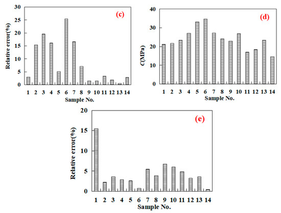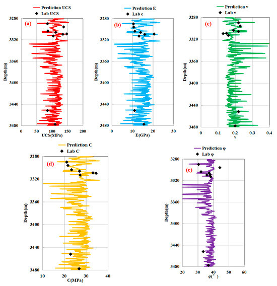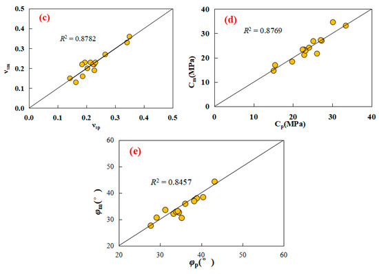 The values measured vs. predicted for the rock mechanical properties: ((a) uniaxial compressive strength; (b) Young’s modulus; (c) Poisson’s ratio; (d) cohesive strength; and (e) internal friction angle.