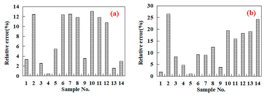 On the basis of the above research, the new empirical equations (Equations (23)–(27)) can be used to calculate the rock mechanical properties for the Permian Lucaogou Formation shale oil reservoirs, which can be compared to the experimental data. The values measured vs. predicted for the rock mechanical properties are presented in Figure 12. The solid line in Figure 12 is a 1:1 slope line, and a point located on the 1:1 slope line suggests an extremely good correlation. It can be noted from Figure 12 that the values of predicted rock mechanical properties based on the new equations are consistent with the corresponding measured values and the coefficients of determination for new equations are more than 0.80. Furthermore, the plots of the relative error for the calculation results of new equations are described in Figure 13. From Figure 13, it can be seen that the average relative errors are 7.48%, 12.40%, 8.57%, 5.52%, and 4.42%, respectively. In conclusion, the equations can provide satisfactory representations of rock mechanical properties for shale oil reservoirs, which can avoid other time-consuming test procedures.