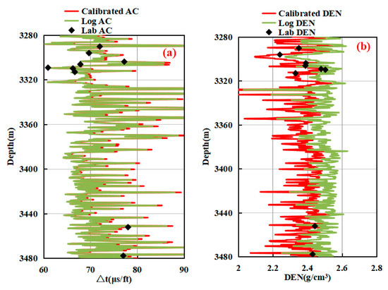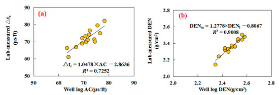 Bulk density and P-wave velocity are parameters that can be obtained from the density and sonic logs, respectively. These parameters are conventional well logging data and usually used to gain formation information. A wellbore environment such as formation temperature, pore pressure, drilling fluid, etc., can have a considerable impact on the readings of well logging, resulting in the differences in the P-wave interval transit time and density values between well logging and laboratory-measured data [37]. Therefore, before using the P-wave interval transit time and density logging data combined with empirical equations to evaluate the rock mechanical properties, it is necessary to calibrate the P-wave interval transit time and density values obtained via well logging with respect to the laboratory-measured values. Using the linear fitting regression of laboratory-measured and logging values, the fitting model was established, shown in Figure 14. Thus, based on the model, the P-wave interval transit time and density values from well logging were calibrated. The formulas are as follows:
