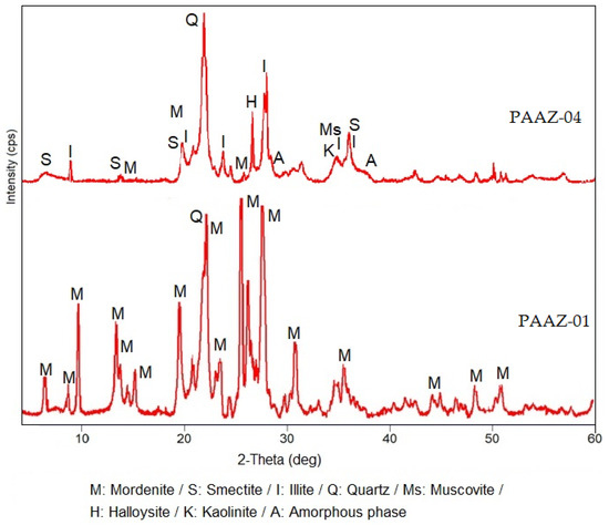 The study to determine the different mineral phases present in the PAAZ-01 and PAAZ-04 samples (Figure 4) established the dominant presence of neoforming mineral species such as mordenite and smectite, accompanied by secondary phases such as halloysite, illite and quartz, which were formed by a hydrothermal process that caused particularly intense zeolitization and smectization [31]. Section 3.1 describes in detail how the neoforming minerals have replaced the original minerals. On the other hand, Leone et al. [32] describe these isomorphic and pseudomorphic substitution processes as an enthronement of new mineral varieties. This process is interpreted in this work as a diffusive event of bidirectional character by which the hydrothermal solutions captured ions from the host rock (original pyroxenic andesite) and provided foreign ions that created mordenite and smectite. As can be seen in Figure 4, there are some compositional and morphological differences in both samples. The PAAZ-01 sample presents more pronounced and intense peaks that show a high crystallinity of the mineral species present, mainly mordenite, while in the PAAZ-04 sample, the intensity of these peaks tends to attenuate significantly. Another detail to highlight in this last sample is the presence of amorphous phases, possibly produced by the formation of glass in the places where the hydrothermal solutions, still hot, experienced rapid cooling [28]. Another interpretation could be that this amorphous phase was deposited during the pyroclastic events that took place in this region during the Neogene period [33].
