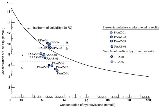 Figure 5a–d presents the results of the chemical analysis of pozzolanicity, both at 8 and 15 days. As can be observed, the samples of unaltered pyroxenic andesites UPA-01 and UPA-02 do not show any pozzolanic behavior at 8 days of testing (Figure 5a); however, even though after 15 days they tend to move imperceptibly towards the isothermal solubility curve (Figure 5b), they do not come into contact with it. For this reason, it is concluded that samples of unaltered pyroxenic andesites lack pozzolanic activity in their natural condition without being ignited. The reason why these samples do not have pozzolanic reactivity could be mainly due to their mineral composition, meaning that the SiO2 present in the structure of pyroxenes and amphiboles is strongly combined in the silicate structural group, forming stable crystalline structures, which prevents their reaction with cement. However, Martín et al. [34] have achieved hydraulic reactions of materials of volcanic origin through a very fine grinding process which causes an increase in the surface area of the grains and consequently their pozzolanic reactivity.