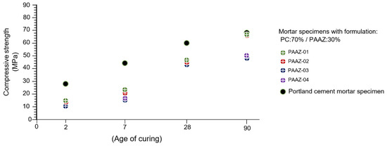According to the data observed in Figure 6, we calculated that the increase in initial mechanical resistances (2 and 7 days) in the most reactive samples is 11.5% and between 18.8 and 26.9% for normal resistance (28 days), when the PC/PAAZ formulation is 75:25%. In the case of the formulation PC/PAAZ-70:30% (Figure 7), the initial mechanical resistance increases by 8.6%, while the normal resistance increases by 22.8%.
