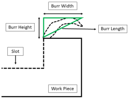 In the current work, titanium grade 9 was machined using the micro-milling process. The process outcome was assessed by measuring the surface roughness, burr size, and tool flank wear using an Olympus digital microscope (DSX1000; Olympus Corporation, Tokyo, Japan) with a repeatability of 1 µm. Slots were machined, as shown in Figure 1. The surface roughness was measured by taking multiple readings in the machined slot, as indicated by the yellow square. The black outgrowth visible on both sides of the machined slot, known as burr, is an unwanted and undesirable phenomenon. Burr is a sharp edge or ridge of material that forms along the edge of the workpiece. In the current research, the burr height and burr width were determined using microscopy images. Since the burr length could not be measured accurately owing to the curve of the burr, it was calculated using the Pythagorean theorem, incorporating the burr height and width, as illustrated in Figure 2. Although some previous researchers have used chip thickness and/or chip area calculations using imaging software for burr area measurements, the current study focused on directly measuring the burr height and burr width using an Olympus 3D digital microscope, which was then used to determine the novel burr length.
