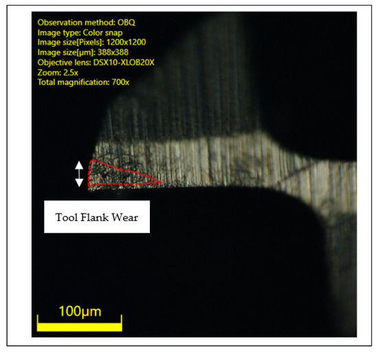 With regards to tool wear in micro-milling, ISO 8688 standards were followed, which encompass different forms of tool wear, including flank wear, chipping, face wear, outside edge wear, and catastrophic failure [39]. Flank wear is particularly significant, as it directly impacts product quality by increasing surface roughness. Consequently, this study concentrated on the analysis of flank wear, as depicted in Figure 3.