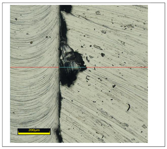 After the experimentation phase, the outcomes were measured with precision and accuracy. The investigation evaluated parameters such as the surface roughness, the flank wear of the cutting tool, and the dimensions of burrs in down milling. A summary of these results is presented in Table 5. Burr width was selected as the primary measurement for quantifying burrs due to its ease of microscopic measurement, as depicted in Figure 4. Notably, the profile measurement inherently encompassed the burr’s height. Therefore, to determine the burr’s length, a calculation method based on the Pythagorean theorem was applied. It is worth noting that the literature has investigated three types of burrs: entry, exit, and top burrs [36]. This study focused solely on the top burr, using the worst-case scenario for all measured burr parameters. The DSX software employs line characteristics to identify the top burr width, with the blue segment on the red line indicating the measured burr width, as illustrated in Figure 4. Surface roughness was evaluated at the slot’s center, with three values recorded for each slot and their average utilized for analysis. The tool’s condition was assessed both before and after experimentation to ensure precise analysis of the tool flank wear. All of the results are presented in Table 5.