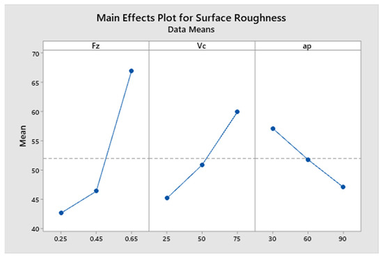 In the next step, interaction plots were drawn among the input variables to analyze their interactional effect, contrary to their individual effects, as discussed for the main effects plot in Section 4.1, Section 4.2, Section 4.3 and Section 4.4. Figure 13 shows the graphical results in terms of output responses of the interacting terms, i.e., fz, Vc, and ap. The non-parallel lines representing input variables demonstrate the interaction between different combinations, including fz*Vc, fz*ap, and Vc*ap. The intensity of influence of each combination was different, as represented by their p-values, given in Table 10. The results of the interaction plot lead toward the goal of the optimization of process responses using the preferred combination of input variables, as covered in the next section.