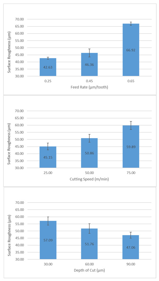 Previous research in the field has identified key process variables crucial for achieving the desired surface finish in the micro-milling of titanium, which encompass tool coatings, cutting speed, tool edge radius, depth of cut, and feed rates [40,41]. Current research, as detailed in Table 6, corroborates the significance of these factors in influencing surface roughness. Among these variables, feed rate exerts the most substantial impact, contributing 62% to the overall outcome, and cutting speed and depth of cut also play significant roles. Notably, the feed rate’s influence is twice as pronounced as that of the other two factors. These factors demonstrated significance in the micro-milling of other titanium grades as well. These results emphasize the consistent importance of these parameters in optimizing surface quality in the micro-milling of titanium.