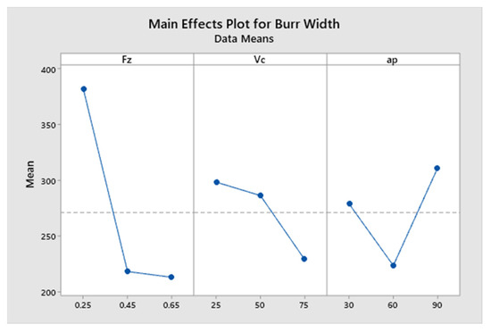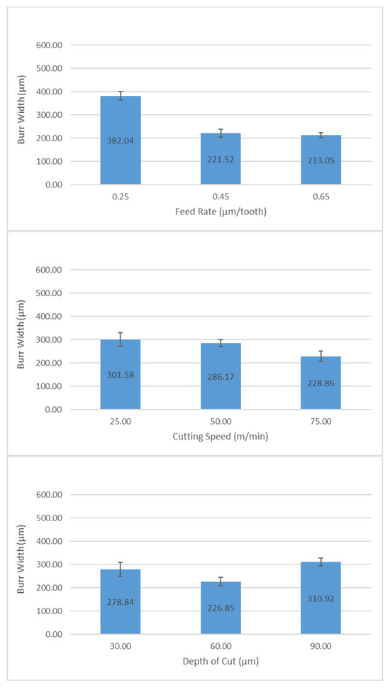 Figure 7 presents the main effects plot detailing the relationship between down milling burr width and chip load. Notably, a discernible inverse correlation was observed between burr width and the feed per tooth. As the feed per tooth increased, there was a concurrent decrease in burr width, reaching a minimum at a feed rate of 0.65 m/tooth. The trend of decreasing burr width with higher feed rates can be attributed to the influence of different material removal mechanisms. When feed rates were increased, the shearing mechanism became dominant, involving a cutting action that efficiently removed material and led to minimized burr formation. The cutting edges worked more effectively at higher feed rates, resulting in a cleaner cut and less plastic deformation, which is a key factor in burr formation. Conversely, lower feed rates favored the ploughing mechanism, where material is pushed aside rather than cleanly cut. This tended to induce more plastic deformation, contributing to the development of larger burrs. The interaction between the tool and the material became less effective at lower feed rates, promoting the formation of burrs. This observed trend aligns with previous studies, including high-speed micro-milling investigations, where an increase in feed rate led to a notable reduction in burr width. For instance, Bajpai et al. [2] reported a 4–35% decrease in burr width with an augmented feed rate. These trends align with research conducted on other titanium grades [42]. Cutting speed and depth of cut were insignificant factors for burr width. The standard deviation for burr width is displayed in Figure 8.