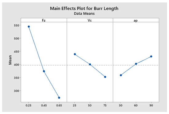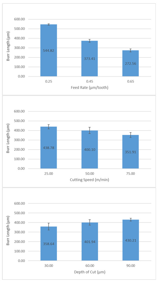 Figure 9 illustrates the main effects plot for burr length. It is evident that burr length was inversely related to feed rate; as feed rate increased, burr length decreased. This phenomenon is explained by the dominance of the ploughing mechanism at lower feed rates, causing plastic deformation and resulting in larger burr size. Conversely, at higher feed rates, the shearing mechanism predominated, leading to smaller burr lengths due to burr chipping. It is also evident from Figure 8 that burr length decreased with increasing cutting speed. Higher cutting speeds generally resulted in reduced material deformation. As the cutting tool moved through the material at a faster rate, there was less time for the material to deform plastically. This reduction in plastic deformation contributed to a decrease in the formation of burrs. Moreover, higher cutting speeds promoted more efficient chip formation, which in turn optimized the burr length. The increased speed allowed the tool to cut through the material with a cleaner shearing action, resulting in well-defined chips instead of material being pushed or dragged, which is associated with burr formation. The standard deviation for burr length is displayed in Figure 10.